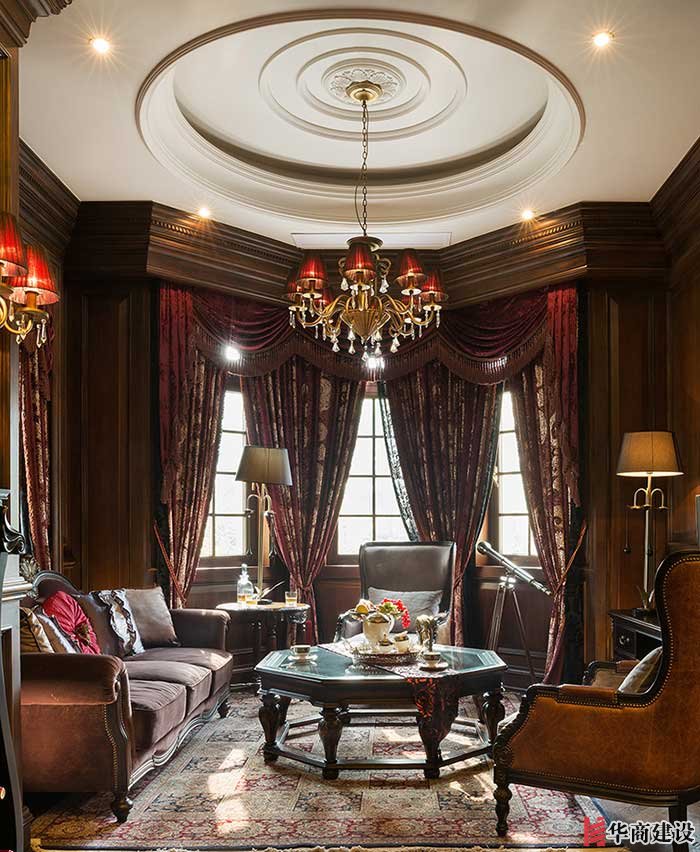其实从诺曼征服和金雀花王朝、兰开斯特王朝以来,英国的贵族就形成了自身悠远的文化传统,到了都铎王朝时期,由于亨利八世的政策,大型的宗教建筑活动停止了,新贵族们开始建造舒适的府邸。在这种情况下,混合着传统的哥特式和文艺复兴风格的都铎式就应运而生。都铎式府邸建筑体形复杂起状,尚存有雉堞、塔楼等哥特风格的遗存;但其构图中间突出,两旁对称,已俨然参照了欧洲大陆的文艺复兴风格。本案在木饰面的使用上将都铎风格发挥到了极致,一些细节的把控,诸如宫廷式的吊灯、壁炉、有流苏的红色天鹅绒被衾、白貂风格的毛毯,其原始概念与贵族的议事厅和贵族的长袍关联,尽显温文尔雅、贵气逼人的气派和不绝如缕的贵族印记。