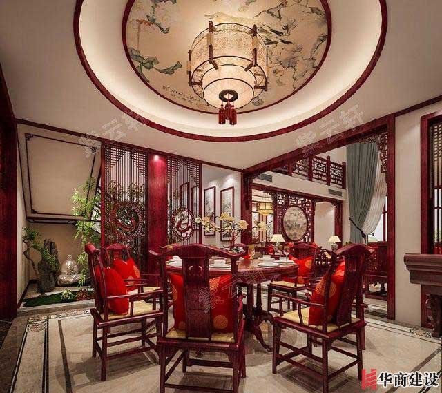 现代中式餐厅装修效果图,餐厅气质偏向幽美静谧,藻井设计雅致有古韵,角落的一簇青绿带来了几许清新,在这样优雅的环境中度过一日三餐,也是一件雅事。