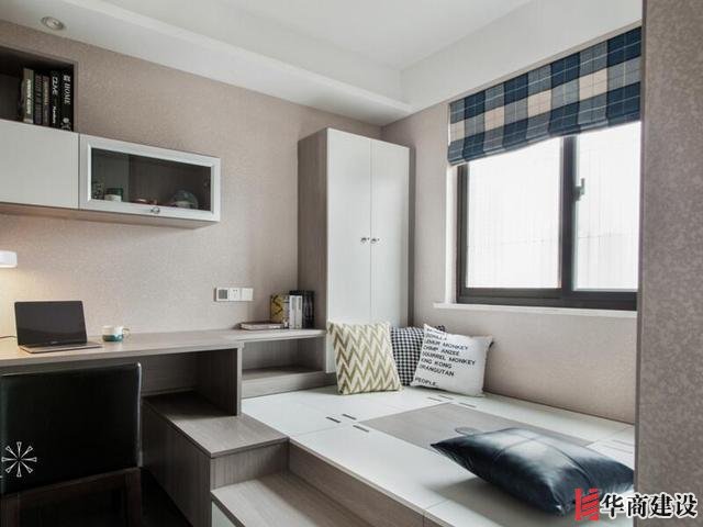 可以根据房间大小定制一个榻榻米+吊柜+书桌的设计,一间房不仅可以休息,而且还能当做书房使用,上下打出的柜子。留下了更多的储物空间,就连反季的衣物都有地方收纳了!